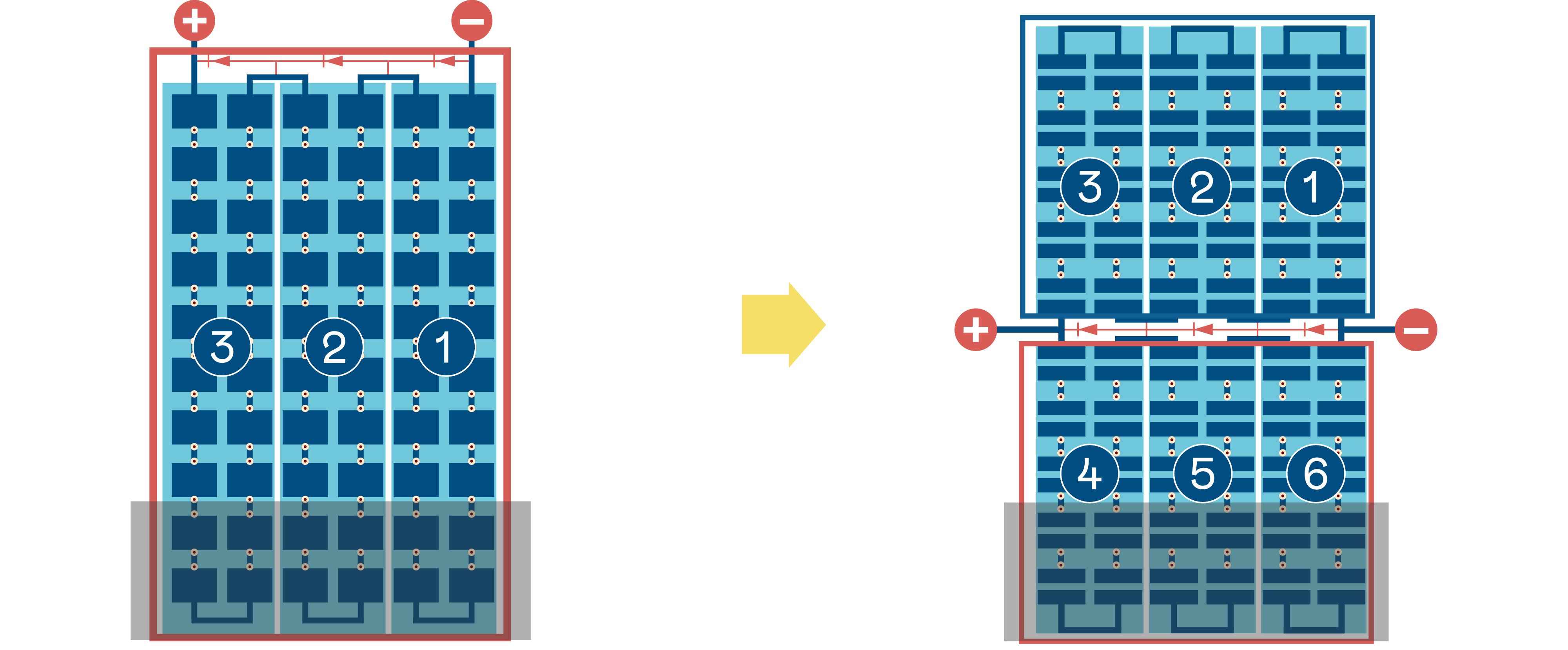 • Integration with half cut battery cell reduces the impact of shading, minimizes the impacts in micro-cracks, and decreases loss due to resistance, further improving the module's power efficiency.