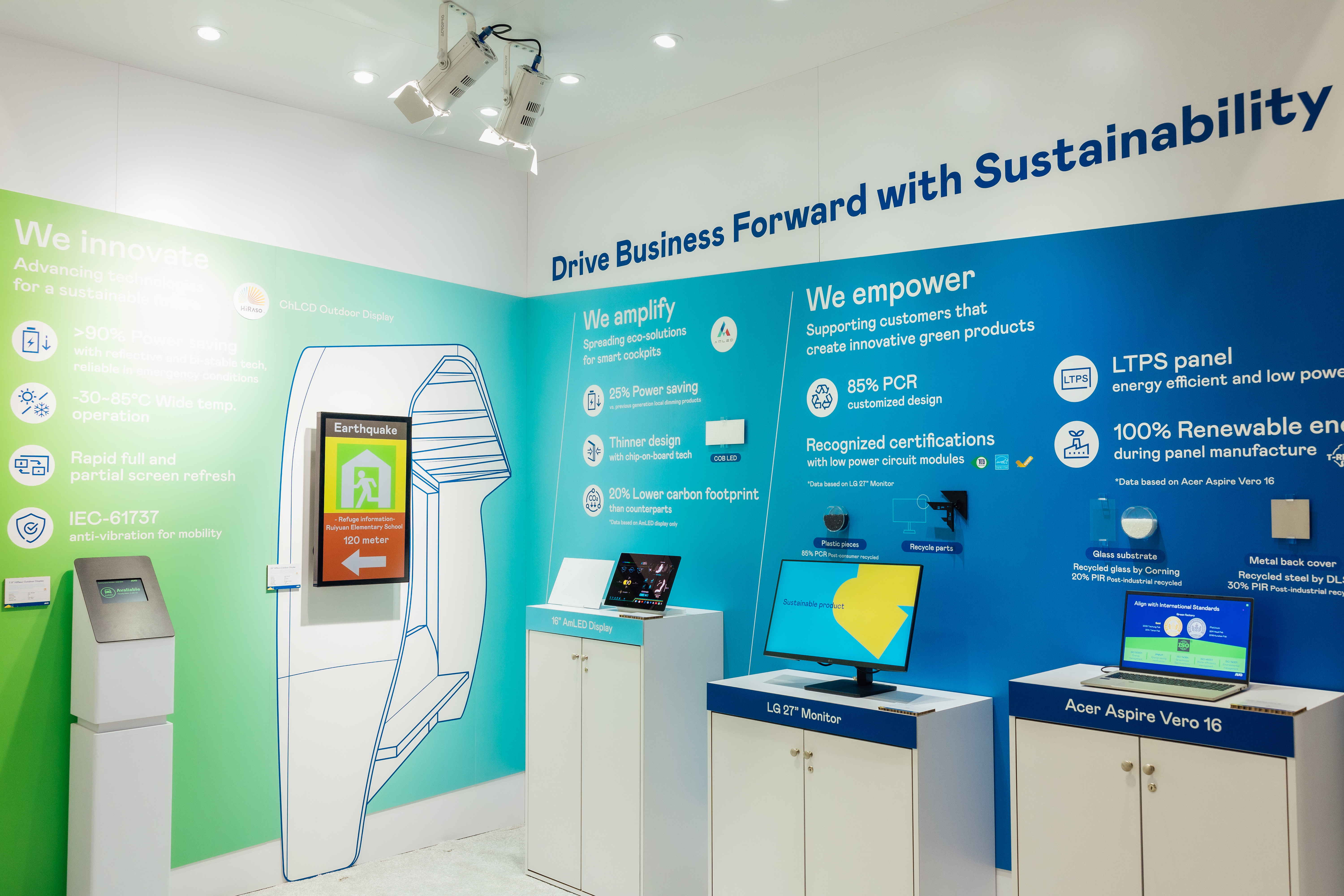 LEYU官網運用創新顯示技術HiRaso膽固醇液晶雙穩態技術達到顯示零耗能、擴大節能省電的AmLED顯示技術應用于車用LEYU官網、以再生的消費后回收(PCR)塑料及全綠電生產之面板,應用于筆電及螢幕,增加綠色價值。