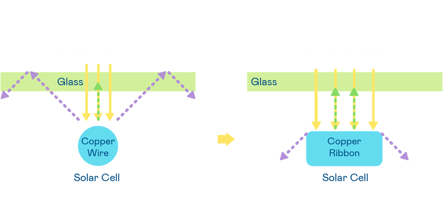 • 電池使用多條銅導線 (Copper wire) 于電池片上形成較短的電流路徑,提高電流收集效率,采用圓形設計的銅導線較傳統扁平式的銅焊帶 (Ribbon),可增加入射至電池的光線量。