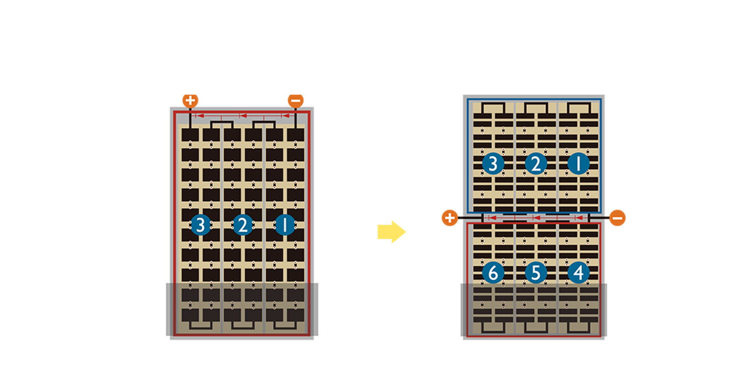 • 結合半切電池,降低遮陰影響、提升模組抗隱裂能力、并減少電阻損耗,進一步提升模組發電效能。