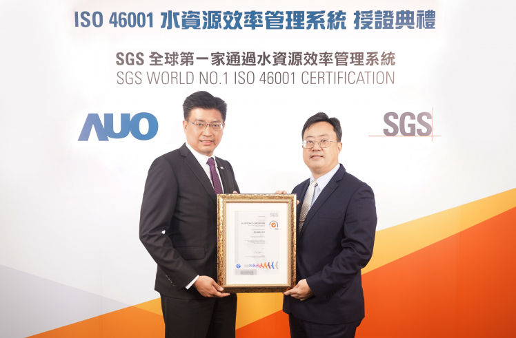 友達(dá)取得全臺(tái)第一張 ISO 46001 水資源效率管理系統(tǒng)驗(yàn)證,透過嚴(yán)謹(jǐn)且精進(jìn)的管理系統(tǒng),具體展現(xiàn)永續(xù)承諾 (左:友達(dá)製造營(yíng)運(yùn)群副總經(jīng)理林挺立,右:SGS 臺(tái)灣檢驗(yàn)科技總裁邱志宏)