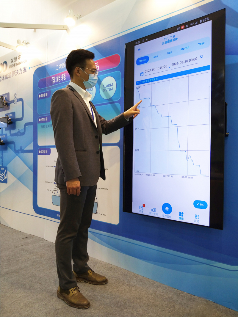 生產過程中所產生的廢水,也能根據平臺上登錄的原物料化學成分資訊做有效分流,進行最佳化水處理,能提高用水效率,同時減少廢棄物排放,達成製程水回收或全廠製程水回收的目標,以循環再利用的優勢強化企業韌性。有別於傳統的廢水零排放技術須仰賴高溫蒸發進行水回收,友達宇沛的新一代常溫蒸發設備 (RTV) 運用低壓蒸氣作為蒸發熱源,搭配吸附劑吸附水蒸氣回收淡水,將操作溫度維持在常溫,除了節省耗能,也可降低蒸發設備在高溫下被腐蝕的風險。同時亦導入參數最佳化 AI 模組,搭配智能監控平臺與監控軟體 App,不僅極大化能源使用效率,節水創水同時兼顧節能減碳,亦能即時監控系統,進行異常通知與故障排除指引,設定設備保養排程與流程指引,提高設備日常維運的便利。