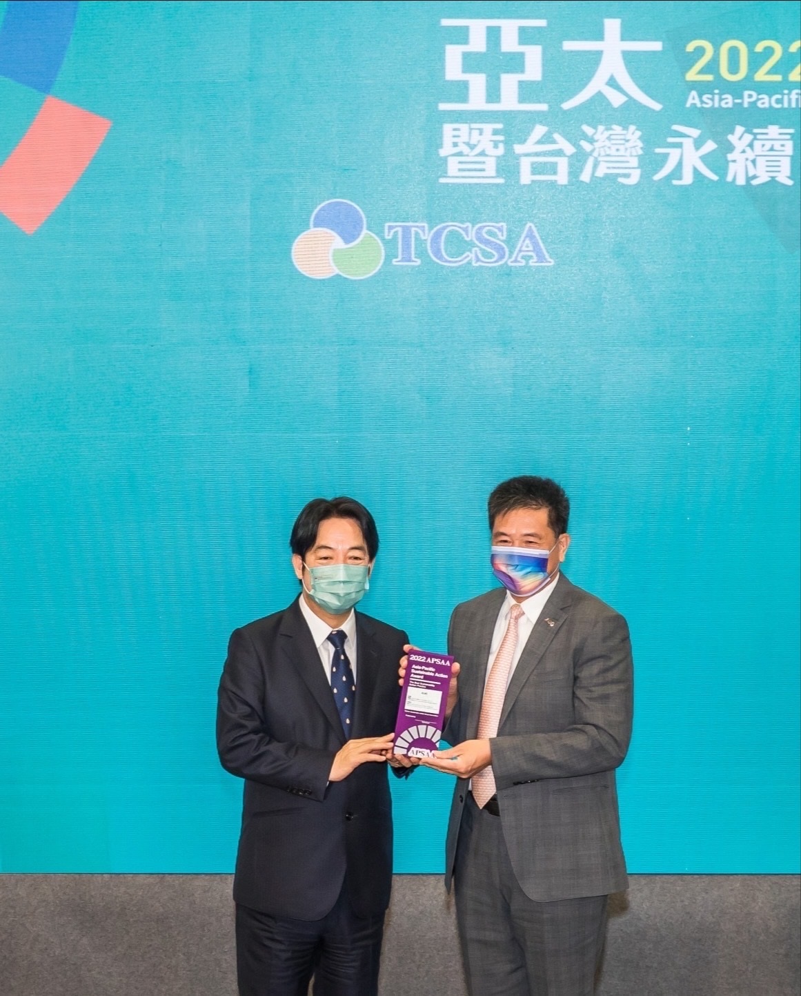 友達以卓越永續(xù)績效表現(xiàn),在第一屆亞太永續(xù)行動獎獲得肯定,由副總統(tǒng)賴清德頒獎(左),友達光電董事長暨執(zhí)行長彭雙浪(右)代表領獎